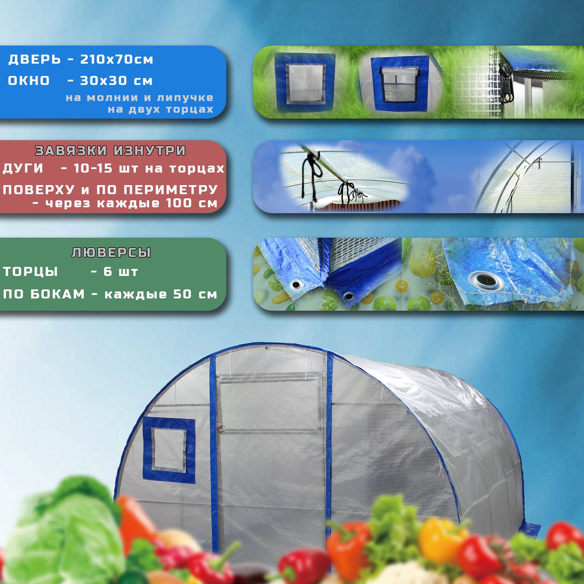 Подходит для арочных теплиц с длиной 400 см, шириной (торца) 300 см и высотой 210 см.Длина дуги арки должна быть 600 см (расхождение не более 3 см)