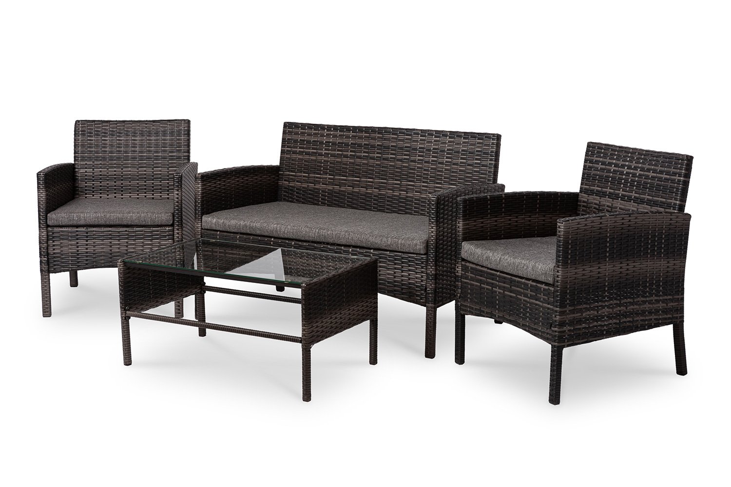 Вся мебель состоит из элементов, идеально предназначенных для использования на улице. Так, металлический каркас, оплетенный искусственным ротангом, не будет портиться от воды, мебель не потрескается и не потеряет свой цвет на солнце. Цвет отделки – серо-коричневый цвет.
