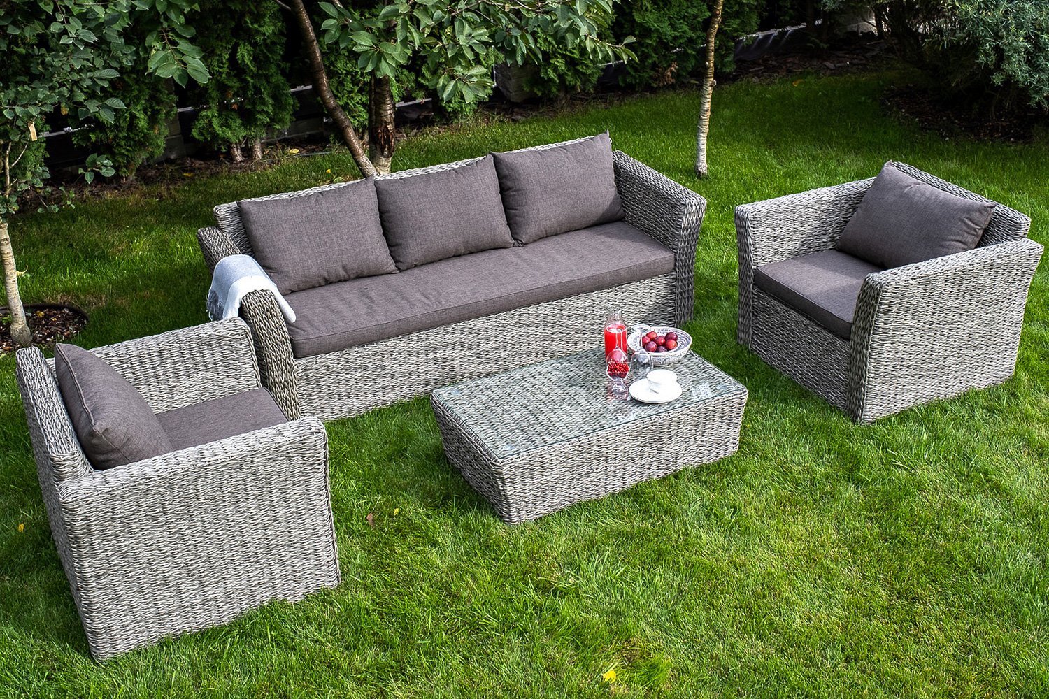 Кресло имеет размеры 104х81,5х86,5 см, и состоит из алюминиевого каркаса и оплетки из искусственного ротанга. Каркас из алюминия достаточно прочные и надежный, при этом имеет небольшой вес, и переносить такое кресло легко и удобно. Материал оплетки же не портиться от осадков, и выступает в качестве декора – переплетение искусственного ротанга схоже с переплетением настоящего дерева.