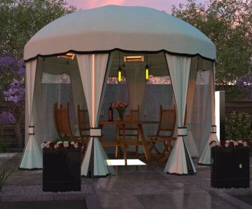 Прозрачный шатер со шторами хорошо пропускает солнечные лучи, наполняя внутренне пространство естественным освещением.